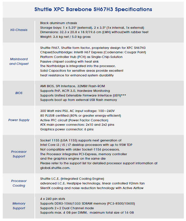 La Mainboard Shuttle FH67 ha un form factor proprietario ed è stato progettata per essere inserita in questo XPC SH67H3. Il Chipset/Southbridge è l'Intel H67 Express (Codename: Cougar Point) con sistema di raffreddamento di tipo passivo, mentre il Northbridge è integrato nella cpu. L'alimetazione è affidata a condensatori allo stato solido, con 3 fasi per la cpu, 1 fase per la igp ed un'altra fase per le memorie Dram. Il sistema dispone di un AMI BIOS, SPI Interface, 32MBit Flash-ROM.