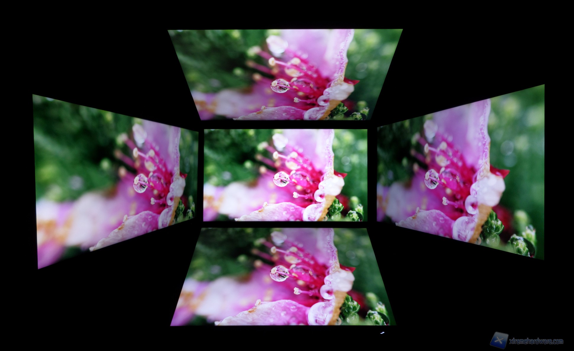 Il pannello AHVA si comporta bene all’aumentare dell’angolo di visione, come ci si aspetta da questa tipologia di matrice. Nella visione laterale si apprezza come il lato più distante tenda a scurire in modo maggiore. Classico è invece il bagliore biancastro (glow) che si verifica con una schermata completamente nera.