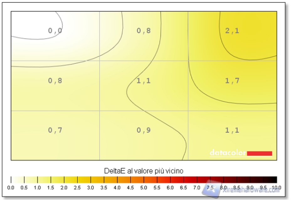 Suddividendo lo schermo in nove rettangoli, abbiamo misurato con il colorimetro l’uniformità della luminosità e dei colori. La differenza massima registrata è risultata pari al 13%, con una media del 9,4%, per quanto riguarda la luminosità, mentre per il colore, il Delta-E maggiore è stato di 2,1, con una media dell’1,0. L’uniformità della luminosità è un po’ sottotono.